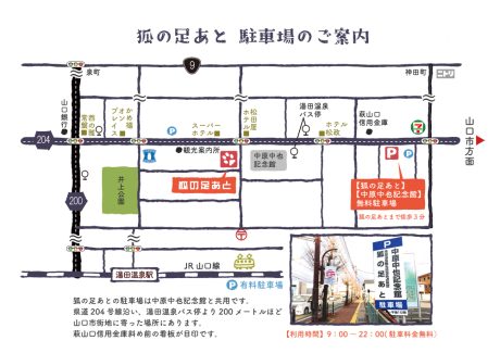 ![湯田温泉観光回遊拠点施設[狐の足あと] 〒753-0053 山口県山口市湯田温泉2-1-3 TEL.083-921-8818 FAX.083-923-2518](https://www.yuda-onsen.jp/wp-content/themes/yudaonsen/img/footer_address.png)