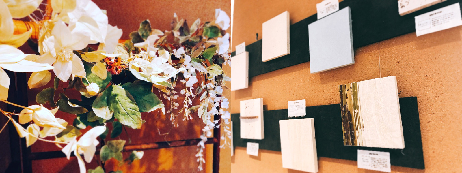 2階廊下、多目的スペースでは徳地和紙で作られたタペストリー、モービル、ペーパーフラワー、カーテン等を展示しています。