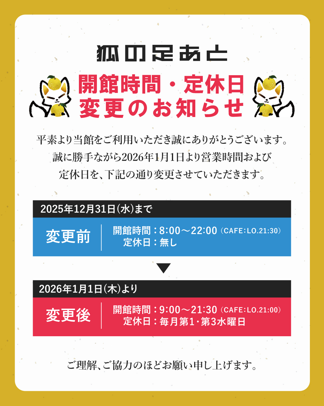 狐の足あと営業時間・定休日変更のお知らせ